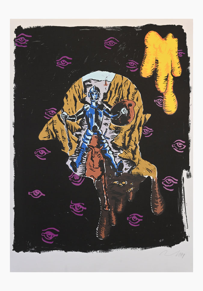 Jörg Immendorff (1945–2007) war einer der bedeutendsten deutschen Künstler der Nachkriegszeit. Sein Werk vereint expressive Malerei mit politischer Aussagekraft. Als Schüler von Joseph Beuys entwickelte er eine figurative Bildsprache, die gesellschaftliche Themen, Geschichte und persönliche Reflexionen verbindet.